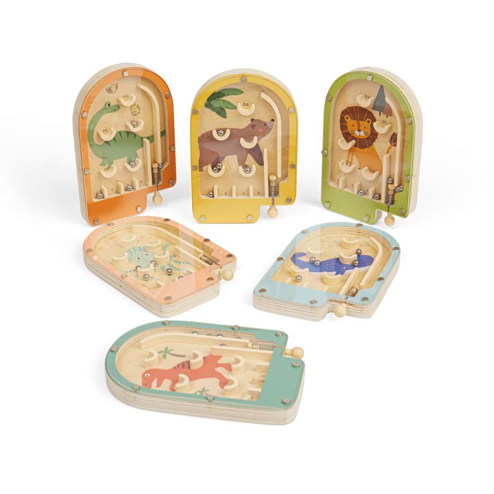 A classic arcade game in miniature, this dinky Whale Pinball Game features a natural wood design and an enchanting animal illustration on the base. Simply pull back the pin to launch the balls into play, then rotate the board to guide them through the obstacles to reach the goals at the bottom.
