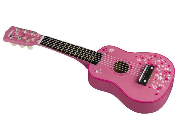 Inspire a talent for music with the Tidlo Guitar. Featuring six nylon strings it looks just like a real guitar, downsized! It even comes with a plectrum for strumming. Made from strong, durable wood this is the ideal first acoustic guitar for any young budding musician, and is easy for small hands to hold and use. Children will love pretending to be their favourite pop star, putting on shows for the family. Attractively finished, the Tidlo Guitar features a delightful design and is available is either blue or pink. A great way to develop rhythm and timing skills from an early age. Promotes sensory play and creativity. Made from high quality, sustainably sourced FSC® Certified wood. Conforms to current European safety standards.