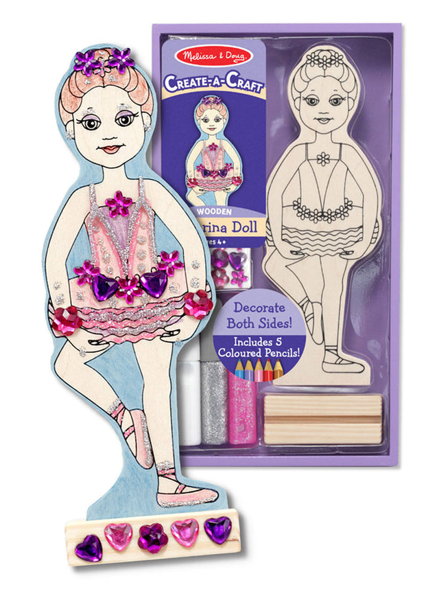 This pretty wooden ballerina doll is supplied with five coloured pencils, gem stickers, glitter and glue, all of which can be used to decorate the doll. The doll is two sided which doubles the opportunities for imaginative fun and comes with a wooden stand to allow proud children to display the fruits of their labour!